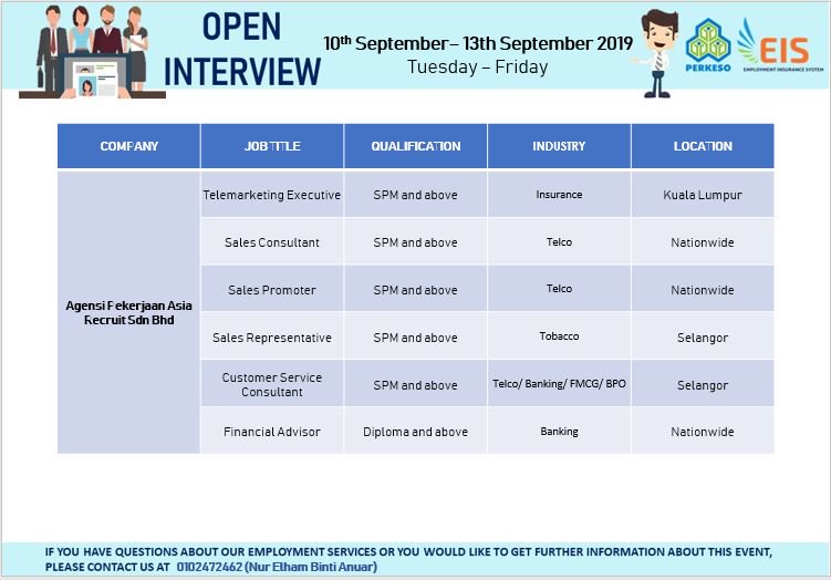 Employment Insurance System Pa Twitter Temuduga Terbuka Mingguan Eis Perkeso Akan Mengadakan Temuduga Terbuka Dengan Kerjasama Asia Recruit Sdn Bhd Bagi Memberi Peluang Pekerjaan Kepada Para Pencari Pekerja Di Luar Sana Anda